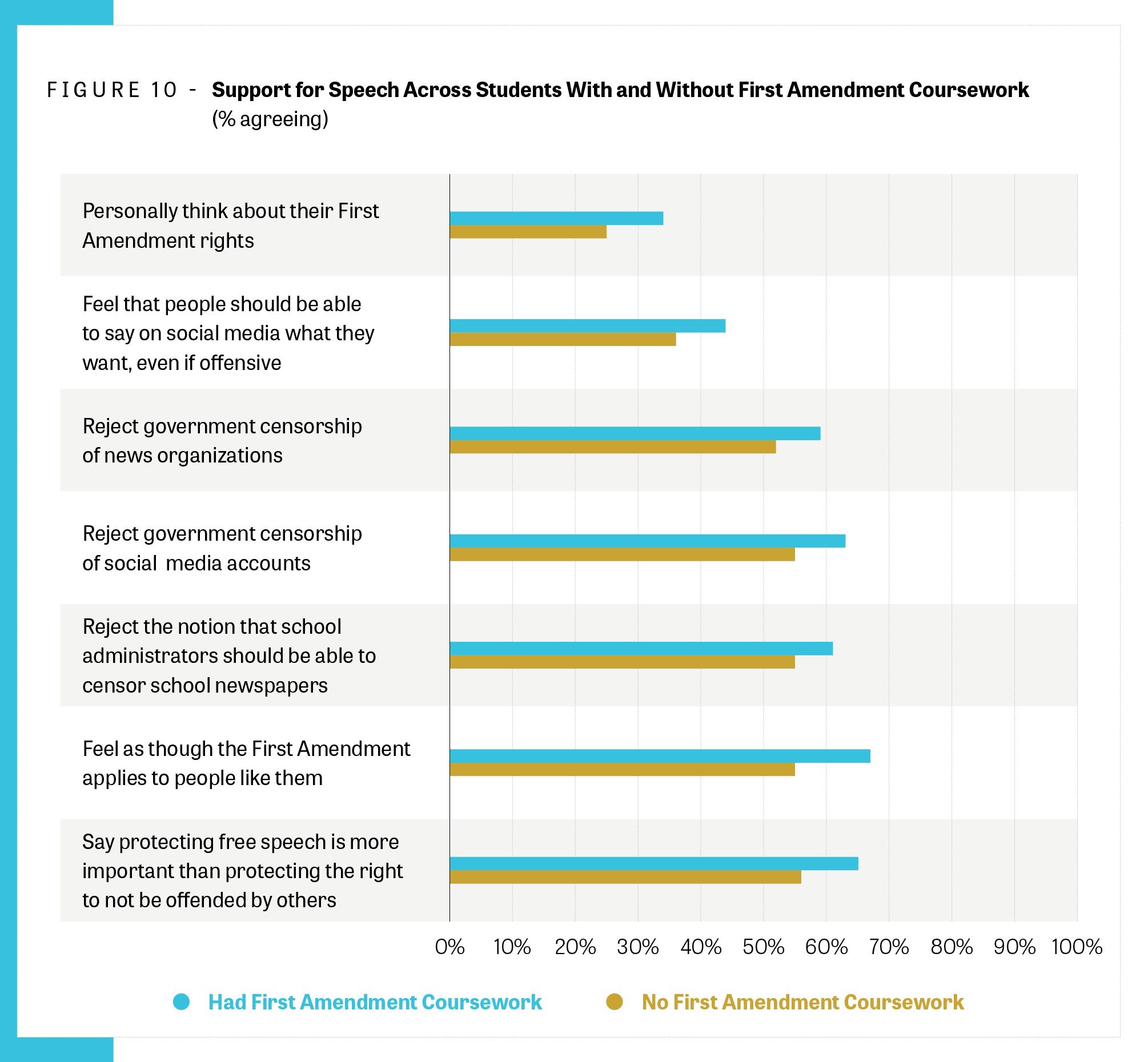 - In every survey we have conducted since 2004, we found that students who have taken classes that include First Amendment content tend to be more supportive of free speech rights than those who have had no such coursework. The 2022 survey once again confirms the connection between First Amendment coursework and support for free speech rights.