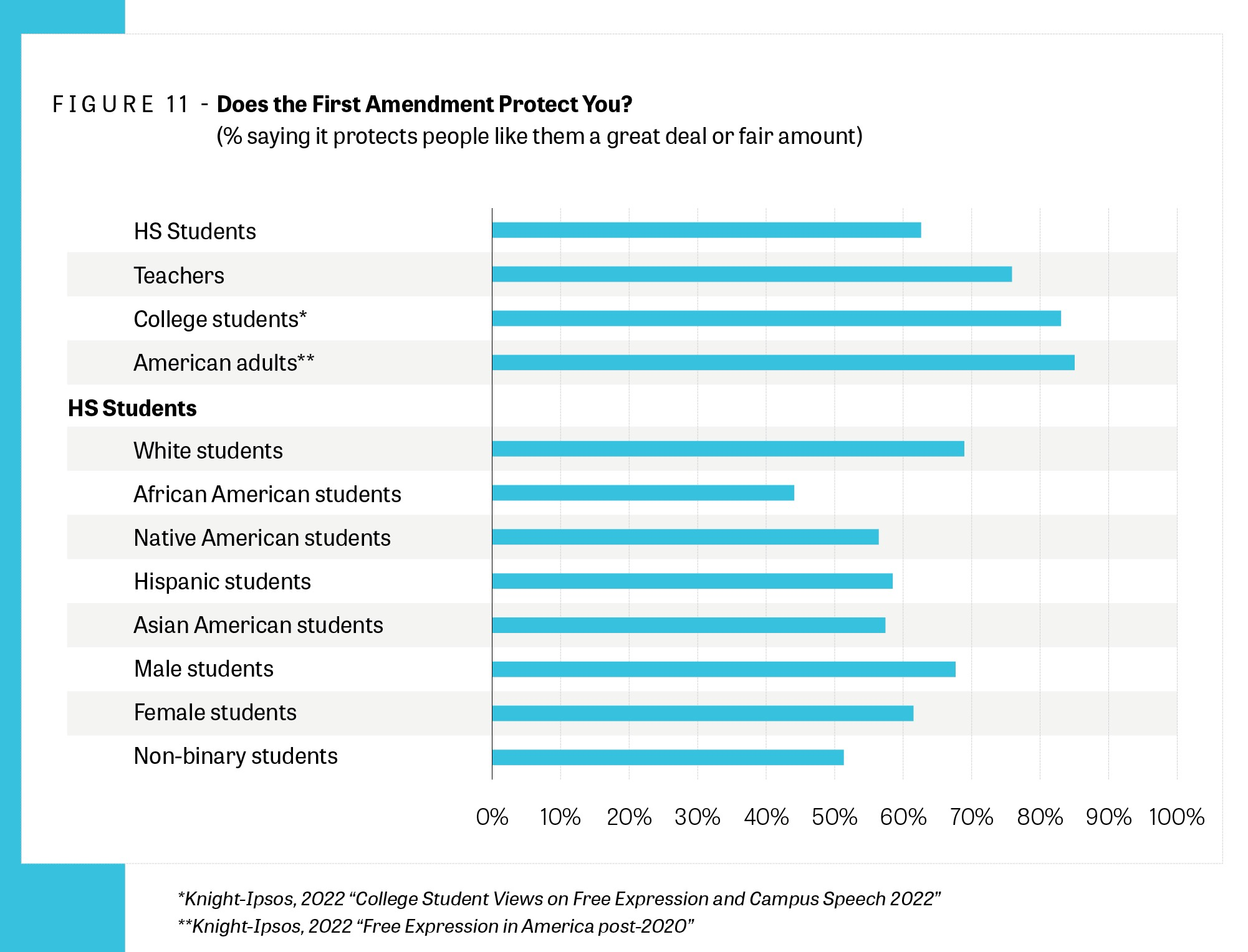 While a majority of high school students (62%) think the First Amendment protects them personally, college students (82%), teachers (75%) and the general public (84%) are all more likely to see the relevance of the First Amendment to their lives. White students (69%) are more likely than Hispanics (58%), Asian Americans (57%) and Native Americans (56%) to feel that the First Amendment protects them; and significantly more likely than African American students (44%). Male students (67%) are more likely than female (61%) and non-binary students (51%) to feel that the First Amendment protects them.