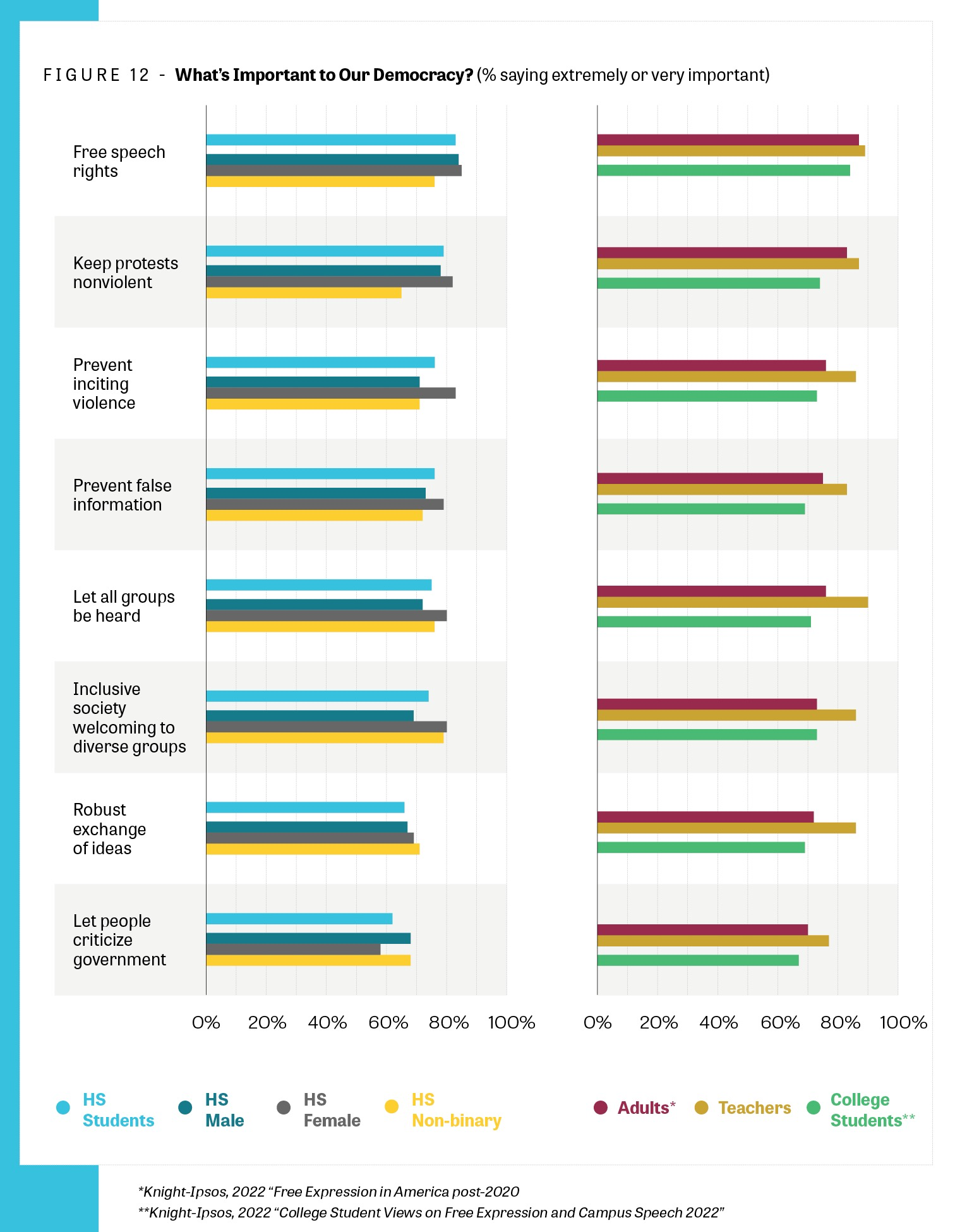 The study also asked select questions from other surveys in the Knight Free Expression Research Series conducted by Ipsos of 1,000 college students (College Student Views on Free Expression and Campus Speech 2022) and 4,000 American adults (Free Expression in America Post-2020) in order to compare the sentiments of these groups to those of high school students.