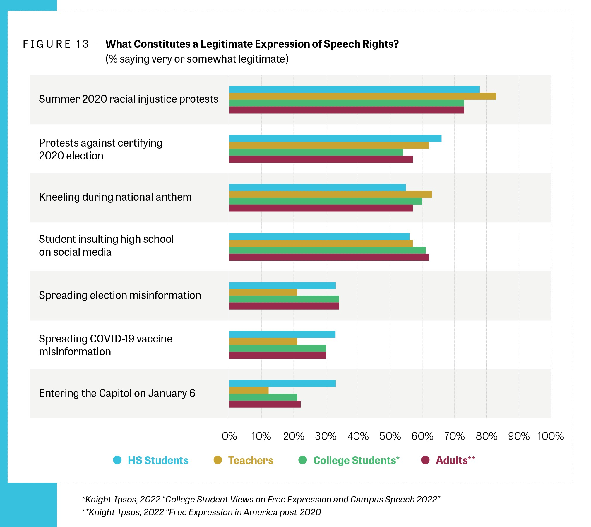 - While 83% of students agree on the importance of speech rights for democracy, they make important distinctions as to what constitutes a legitimate expression of First Amendment rights. Most (78%) view the summer 2020 protests around racial injustice as a legitimate expression of rights. Two-thirds also regard the protests against certifying the 2020 presidential election as legitimate. However, one-third think that entering the Capitol on January 6 to disrupt the certification of the election and the spreading of misinformation about COVID-19 or the election are legitimate.