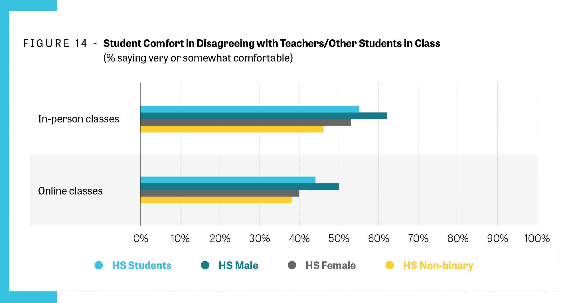 - A slight majority of high school students (56%) are comfortable voicing disagreement with their teachers and other students in the classroom––and students say they are more comfortable doing that in person versus in a virtual classroom. Students and teachers disagree sharply on the authority of school officials to discipline students who make offensive social media posts outside of school.