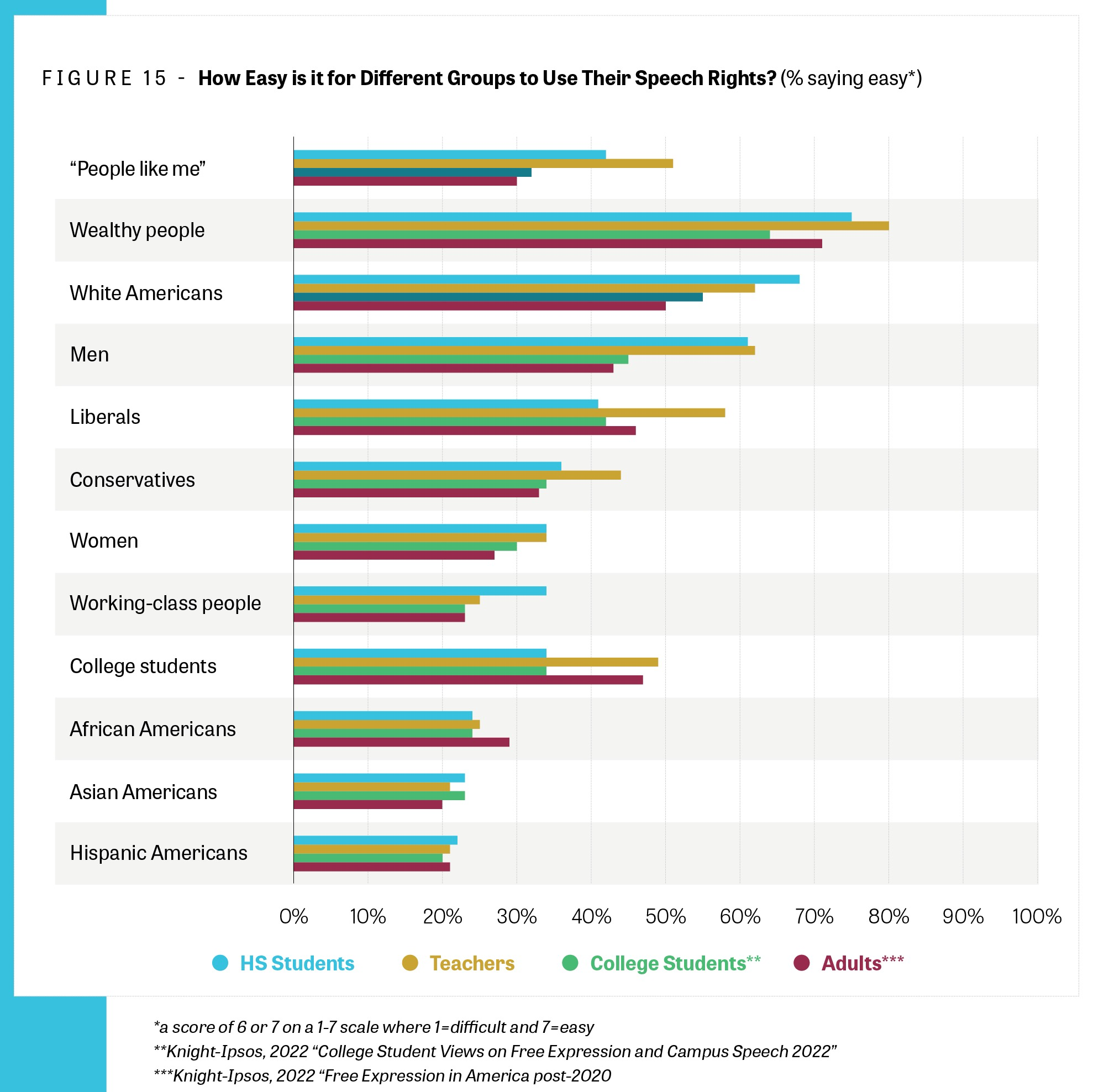 Perceptions vary widely on how easy or difficult it is for different groups to use their free speech rights. Most high school students (75%) believe it is easy for wealthy people to use their free speech rights. Teachers (79%), American adults (71%) and college students (64%) agree that wealthy people have the easiest time doing this.