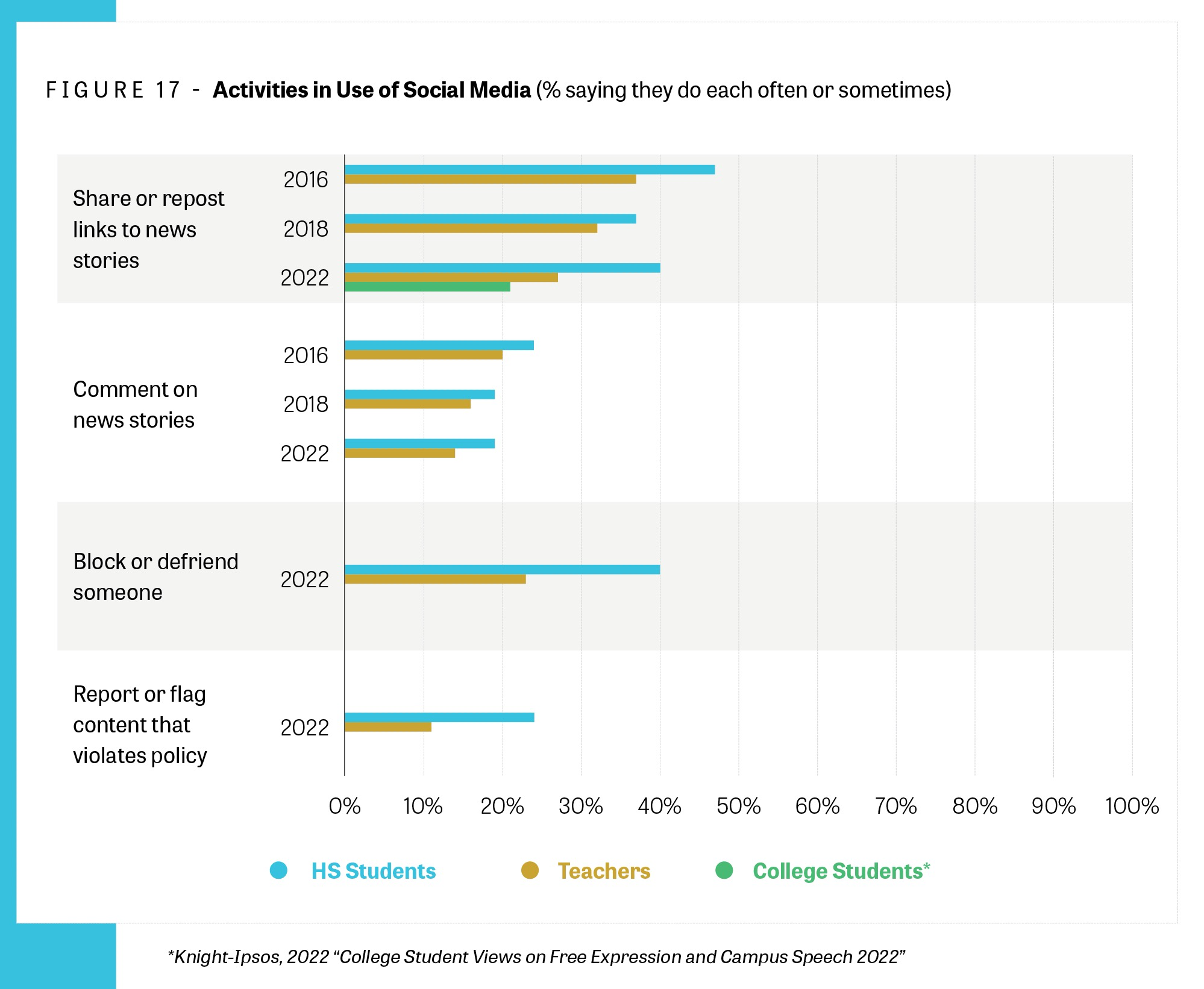 High school students are more proactive than both teachers and college students in using social media: they are more likely to share or repost news stories on social media, more likely to block and defriend, more likely to flag content that they feel violates a platform’s policy. The extent to which high school students engage in sharing/reposting stories and commenting on stories has declined over the past six years.