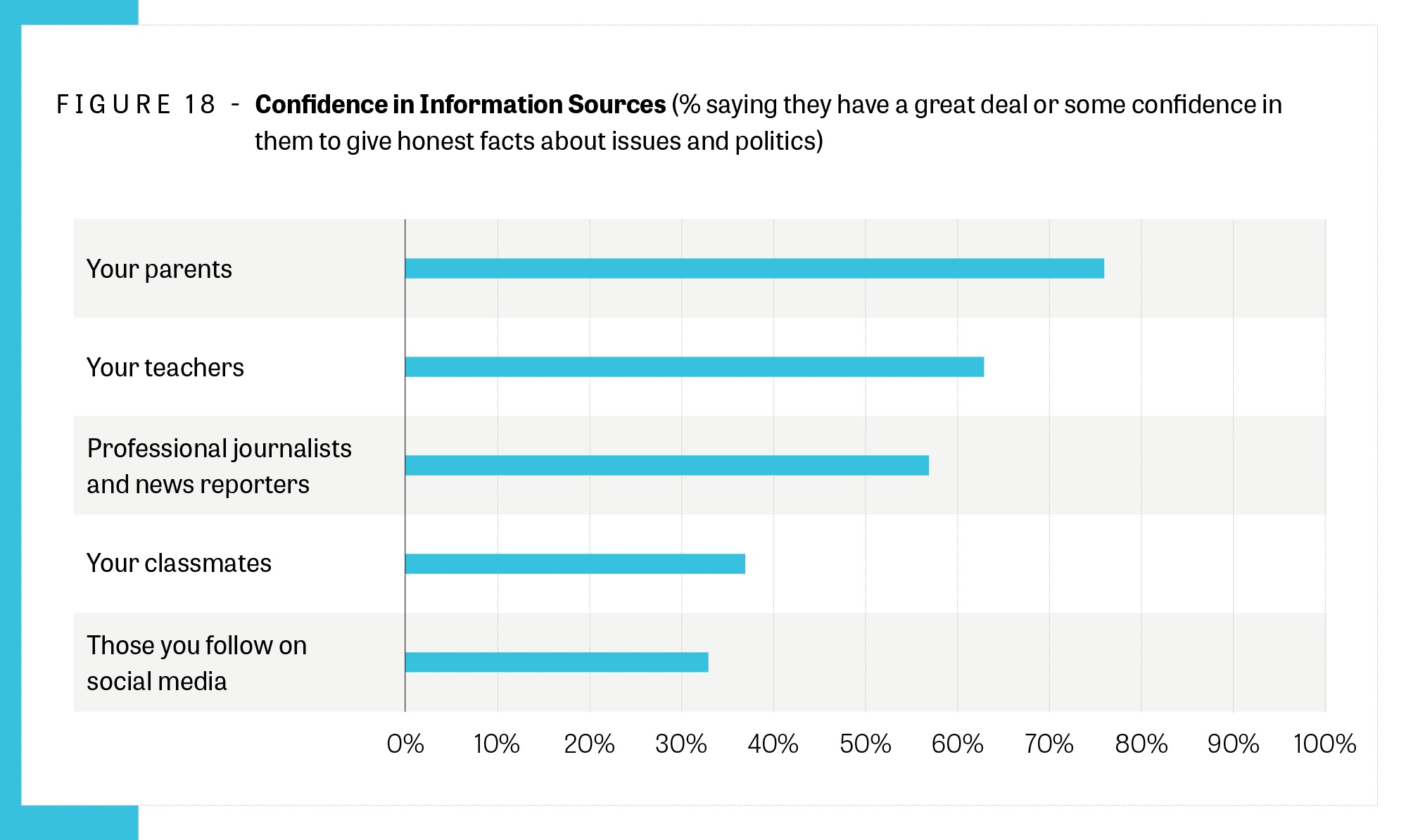 More than three-quarters of high school students are confident that their parents give them the honest facts about issues and politics. About 6 in 10 are confident that their teachers (63%) and journalists/news reporters (57%) give them the honest facts. Far fewer are confident in their classmates (37%) and those they follow on social media (33%).