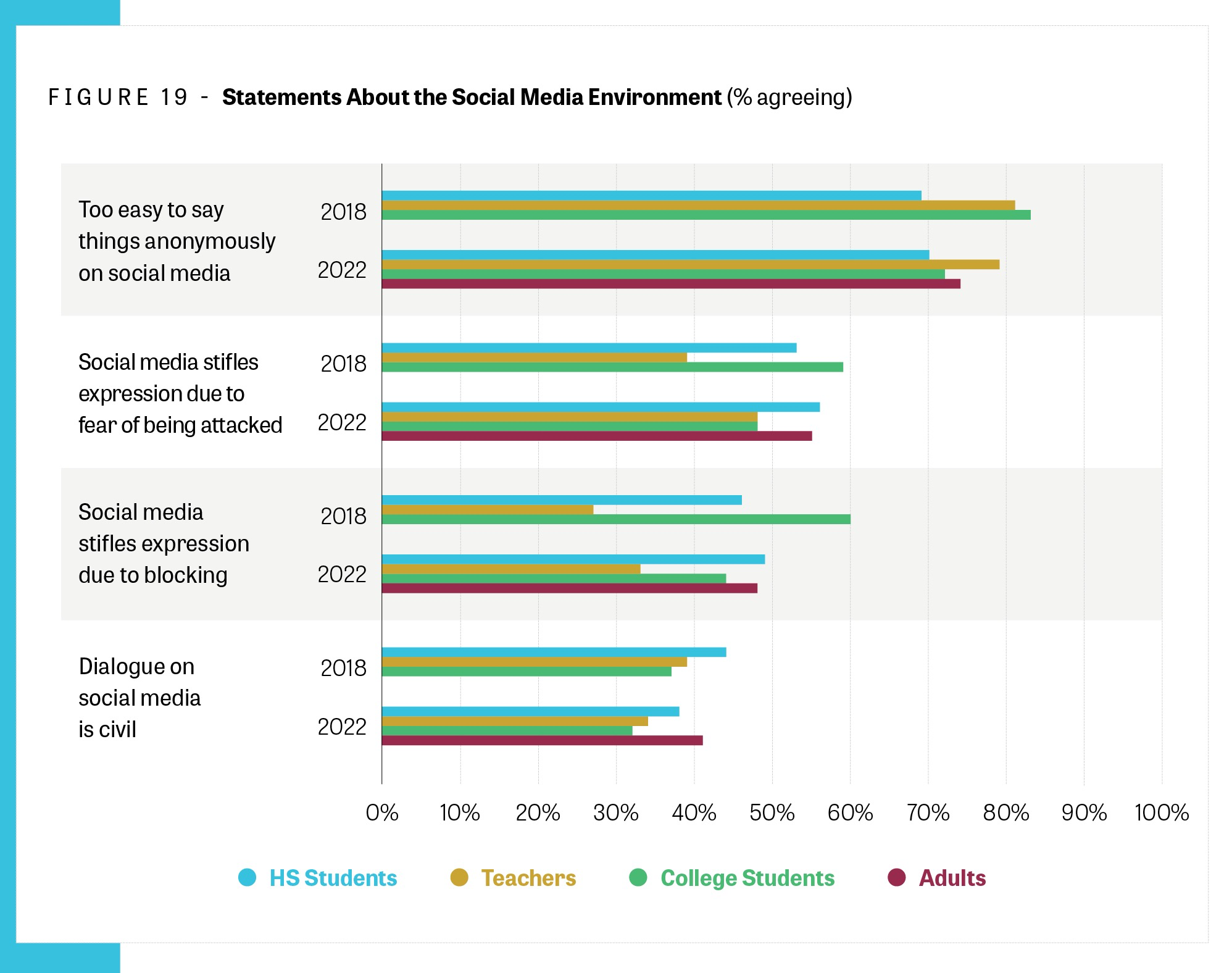 The 2022 Future of the First Amendment survey confirms many of the findings from past surveys, identifies some new trends in student and teacher opinion and sheds light on some new issues related to the First Amendment and free speech rights.