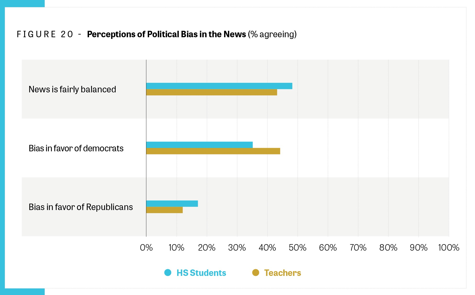 Fewer than half of students (48%) and teachers (43%) believe that the news is balanced. Among students, 35% say news is biased in favor of Democrats and 17% say it favors Republicans. Among teachers, 44% say the news is biased in favor of Democrats and 12% say it favors Republicans.