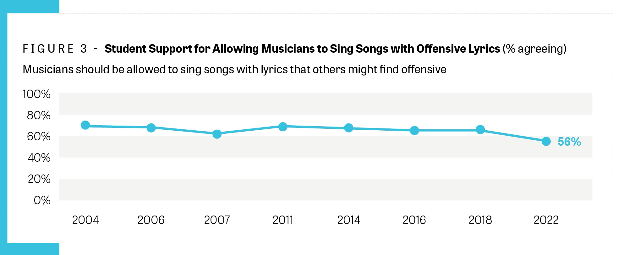 While fairly stable from 2004 through 2018, high school student support for allowing musicians to sing songs with offensive lyrics has dropped over the past four years (from 66% to 56%), trailing teachers (74%). It also lags behind support from college students (76%) and the general public (75%) as seen in Knight-Ipsos survey data. Student support for this right is now at an all-time low since the survey began eighteen years ago, when 70% supported the right of musicians to use offensive lyrics in their songs.