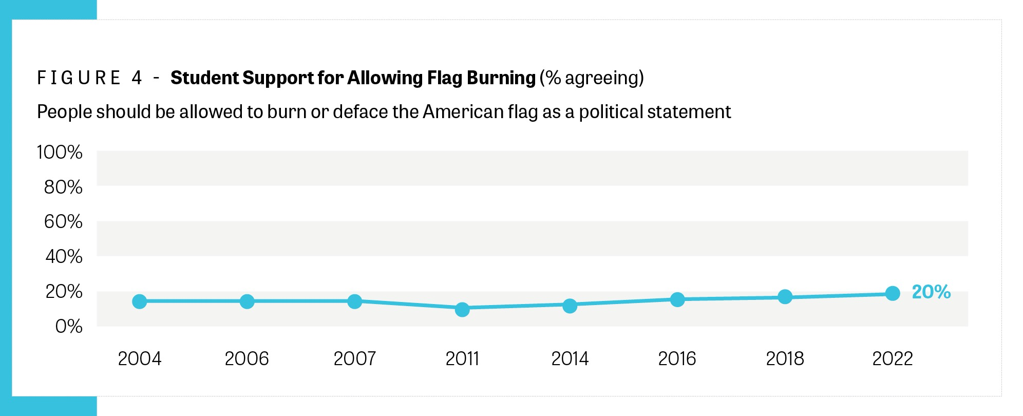 High school students (20%) are less supportive of the right to burn a flag as a political statement than teachers (38%), as well as college students (38%) and American adults (31%), as captured from the 2022 Knight-Ipsos survey. Still, high school student support for this right is now higher than at any point since 2004.