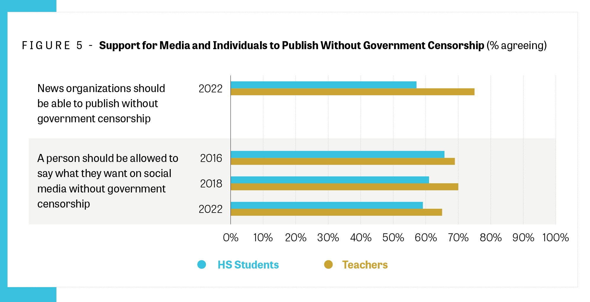 Only 57% of students say that news organizations should not be subject to government censorship. Student support for people posting on social media without government censorship has fallen slightly, from 66% to 59% since 2016. Teachers are more likely than students to reject government censorship of the media by a wide margin.