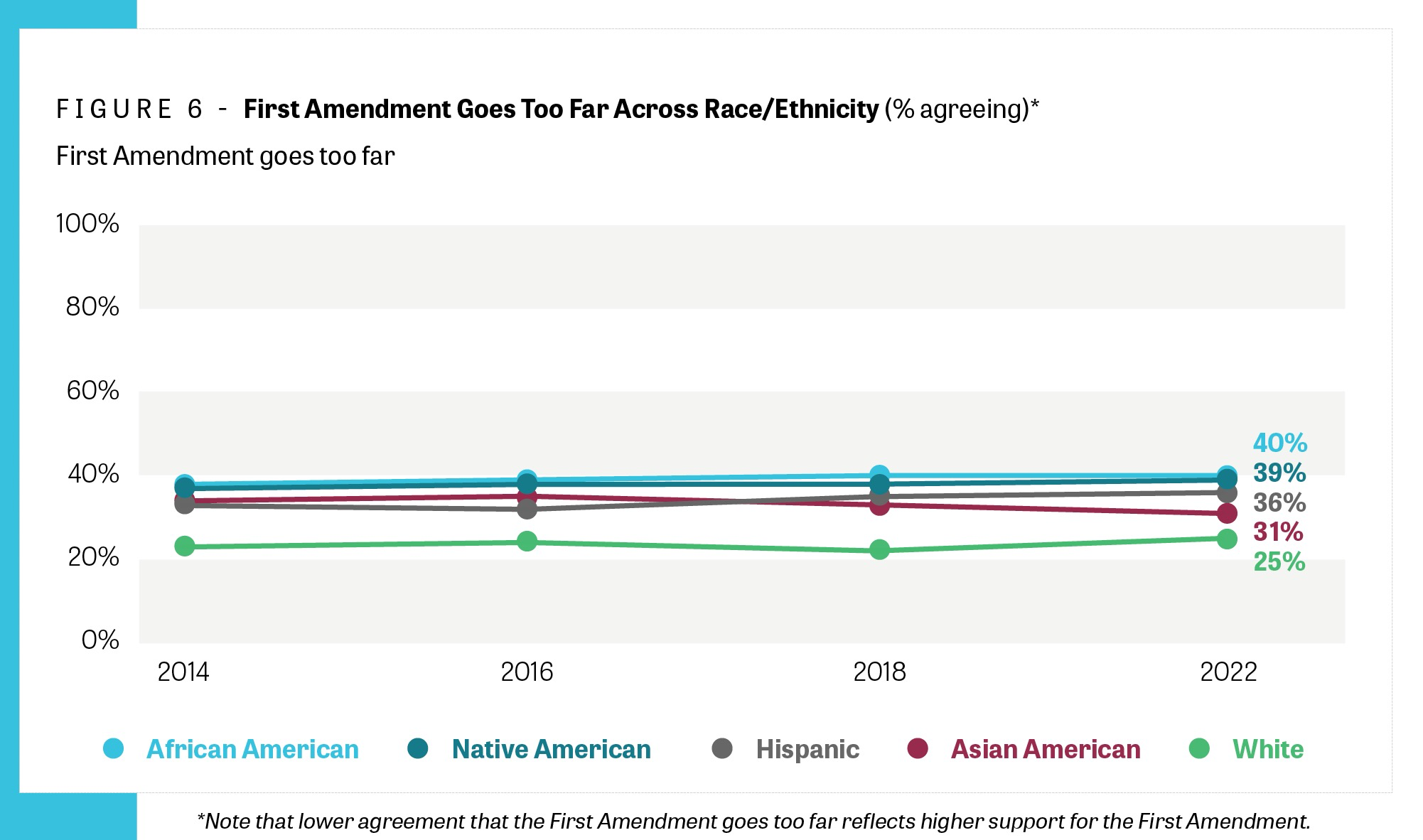 - Consistent with our past surveys, gender as well as race and ethnicity are related to the willingness of students to say that the “First Amendment goes too far” in the rights it guarantees. Students in racial minority groups, women and non-binary students are less likely to feel they are protected by the First Amendment than white and male students.