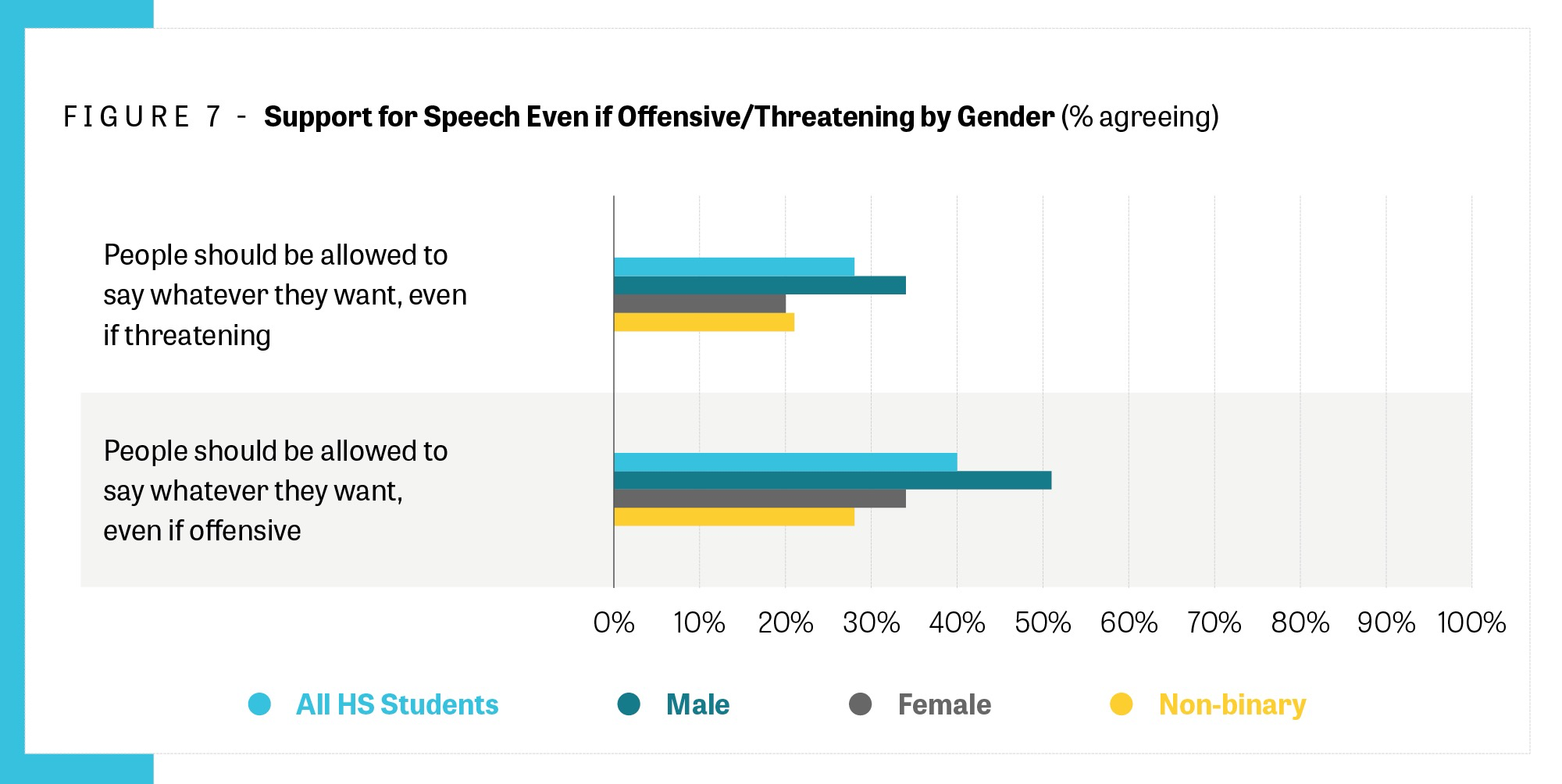 However, there are some significant differences between these groups on specific aspects of free speech. Students are more supportive of free speech than teachers when speech is “threatening,” but less supportive when it is “offensive.”