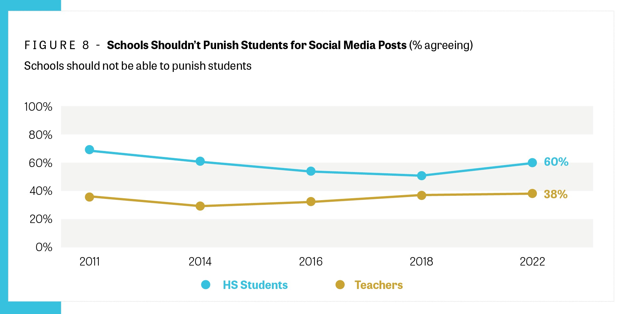 Students and teachers continue to disagree sharply on the authority of school officials to censor school newspapers and discipline students who make offensive social media posts outside of school. High school students (60%), like college students (60%) and American adults (57%) in the 2022 Knight-Ipsos survey, agree that students should be allowed to express their opinions about teachers and school administrators on social media without worrying about being punished by the schools for what they say. Only 38% of teachers, however, agree with this.