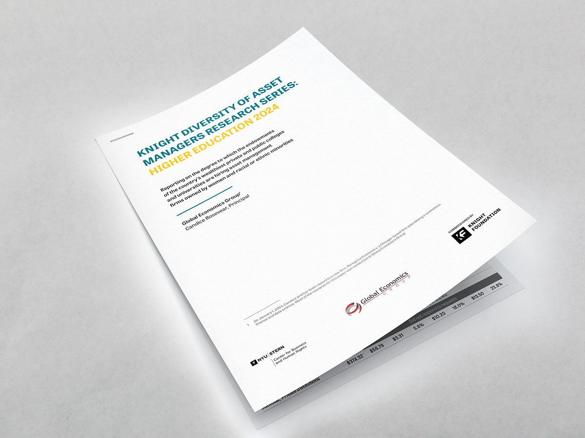 Global Economics Group, Knight Foundation and the Center for Business and Human Rights at New York University’s Stern School of Business (NYU CBHR) collaborated to conduct this study and produce this paper. It is a continuation of the 2022 interim paper on the degree to which the endowments of the 25 wealthiest private and 25 wealthiest public higher education institutions hire investment firms owned by women and racial or ethnic minorities (“diverse-owned firms”).1 This paper builds on the interim paper with additional and updated data.