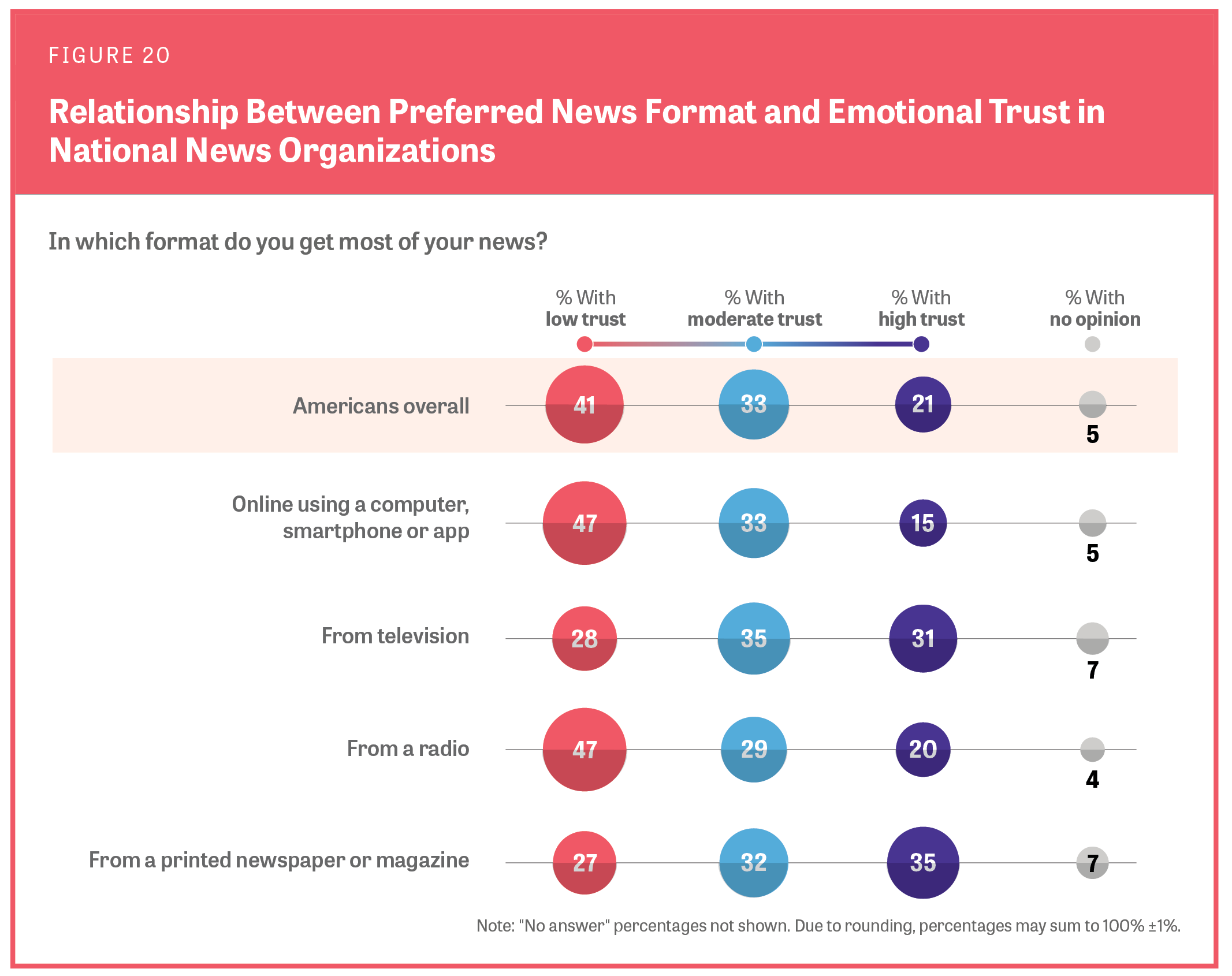 - In contrast, only 28% of Americans who prefer to get most of their news from television report low emotional trust in national news.