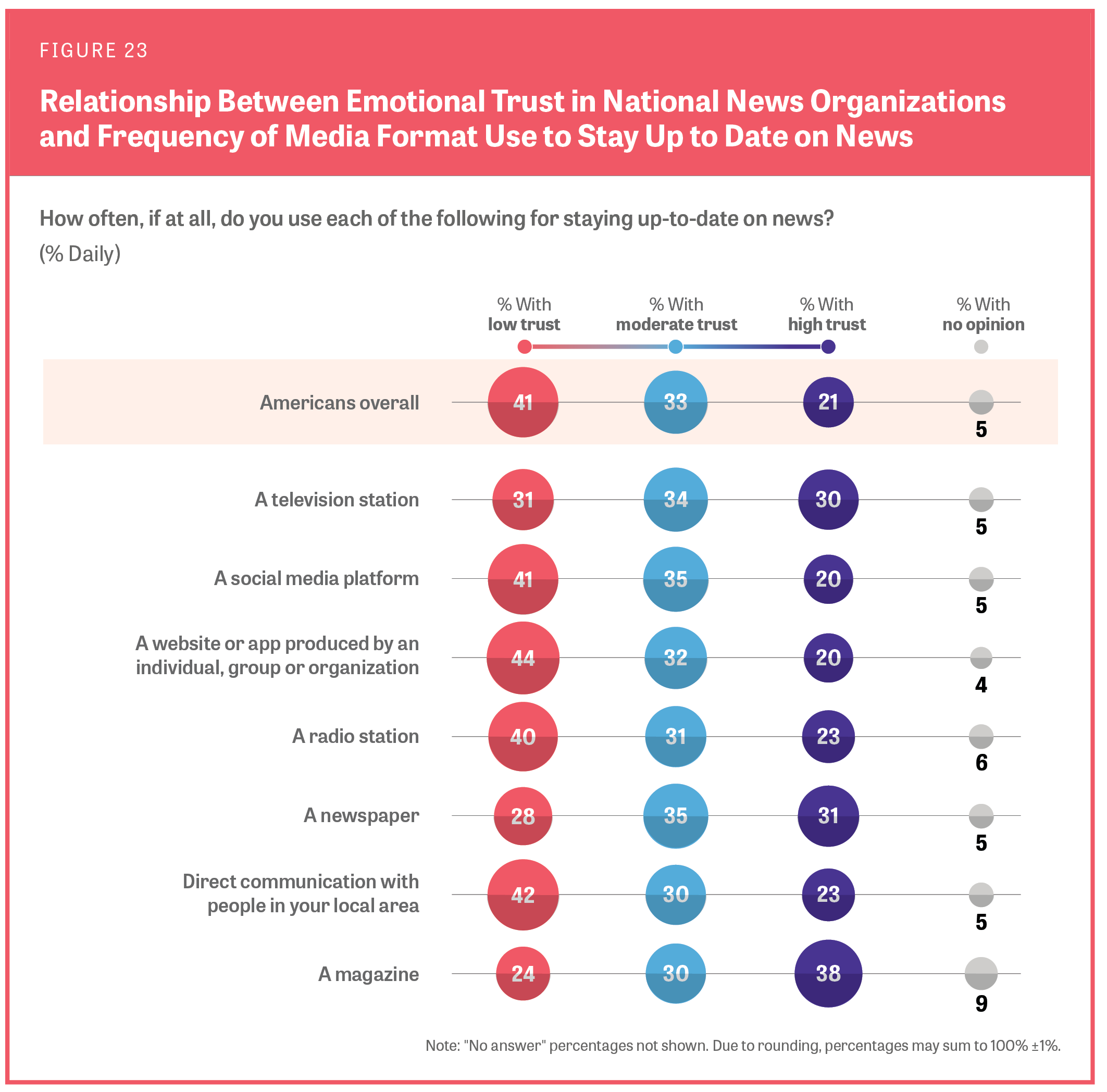 - Americans who get their news daily from television are 10 points more likely to report high emotional trust in national news than those who get news daily from websites or social media.