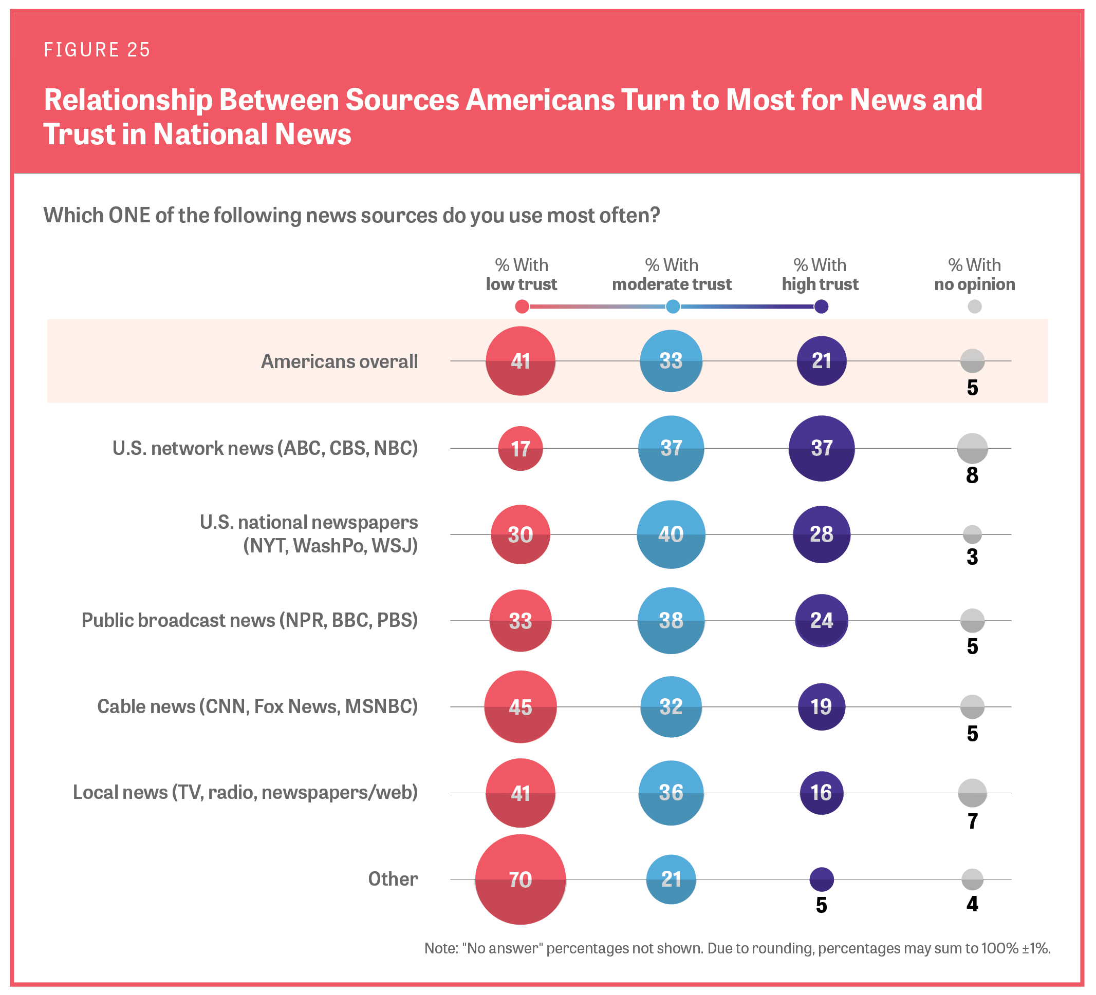 - Forty-five percent of Americans who name a cable news outlet (CNN, Fox News or MSNBC) as their top news source exhibit low emotional trust in national news organizations overall; only 19% report high emotional trust.