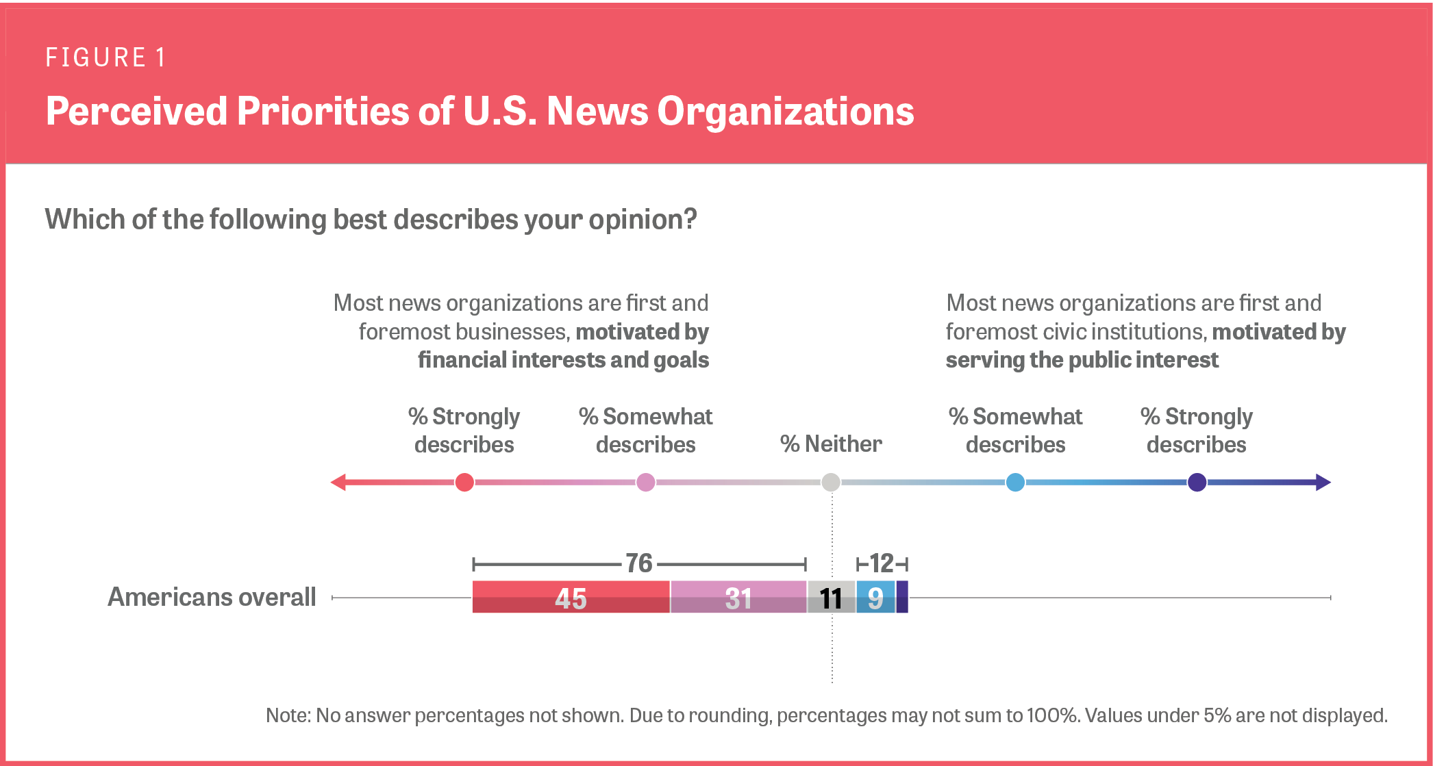 - Most Americans believe news organizations prioritize their own business needs – over serving the public interest: More than three in four say news organizations are first and foremost motivated by their own financial interests, while just 12% of Americans say news outlets act as civic institutions first.