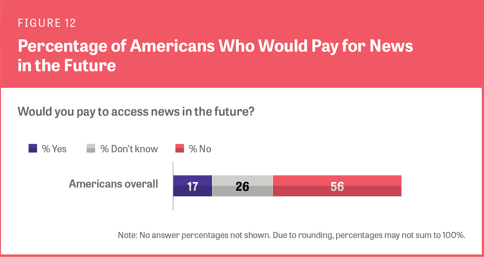 - Despite Americans’ emphasis on the media’s commercial nature, seven in 10 Americans say they have never paid for news. In addition, only 17% of Americans said they would pay to access news in the future.