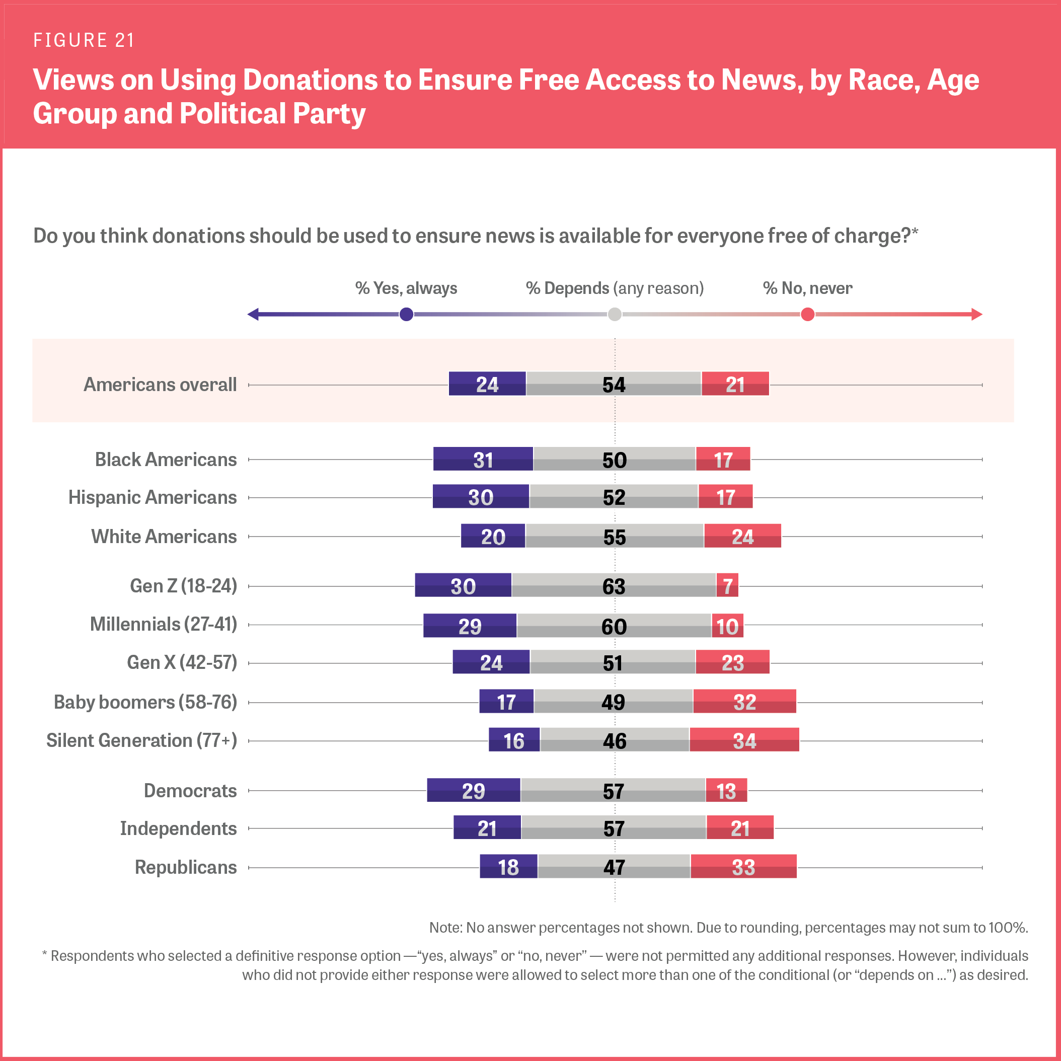 - Americans, particularly Gen Z and millennials, do show an openness to public funding and reliance on private donations as a way to support the news. More than half of Americans are open to government funding and private donations for news organizations to ensure the news is free for everyone, under certain conditions.
