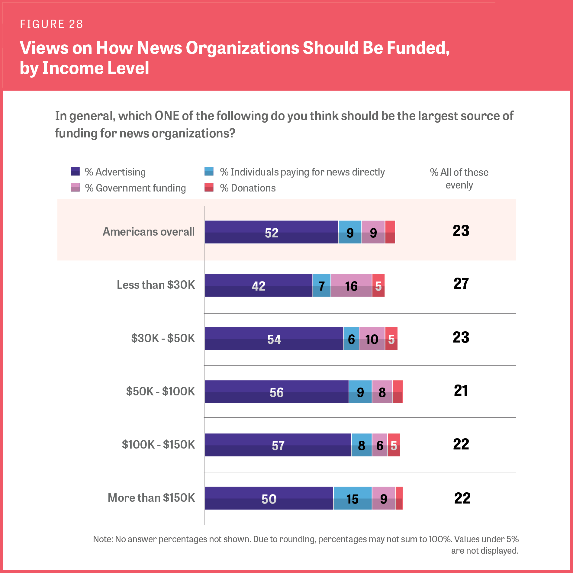 - More than half (52%) believe advertising should be a news organization’s largest revenue source, even though digital ad revenue fails to cover the losses many news organizations are seeing from other revenue streams.