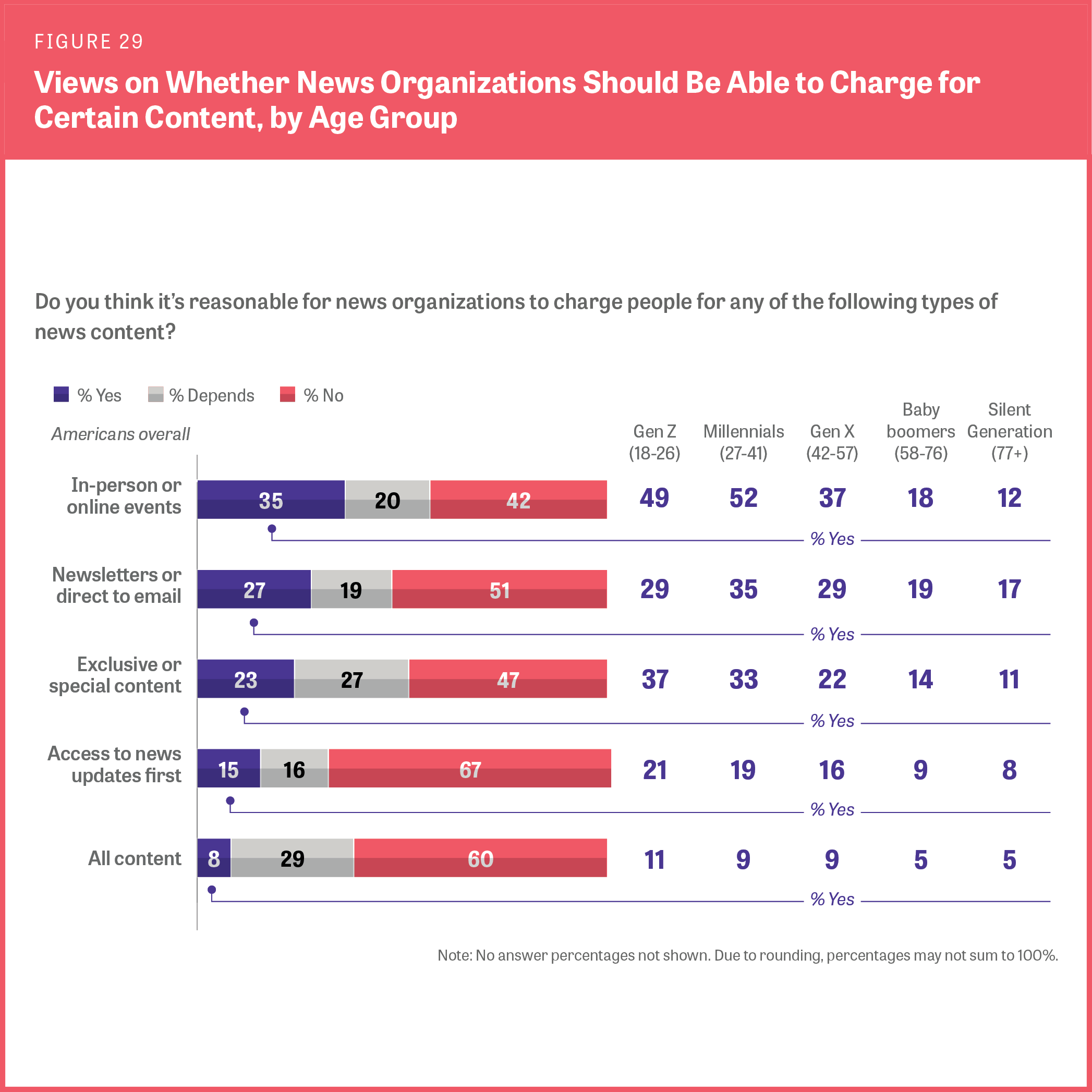 - Events and newsletters could be a promising revenue source: 35% of Americans saying it is reasonable for news organizations to charge people for in-person events and an additional 20% saying “it depends.” Twenty-seven percent say it’s reasonable to charge for newsletters, and 23% for exclusive content.