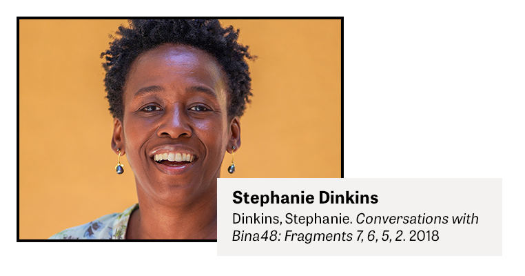 Conversations with Bina48 is an ongoing art project that features a series of video interviews Dinkins conducts with an advanced Black social robot. In 2014, Dinkins started visiting Bina48, a humanoid robot said to be capable of independent thought and emotion, with the aim of befriending her and getting her to answer the question: “Who are your people?” To date, the two have discussed family, racism, faith, robot civil rights, consciousness, loneliness, knowledge, age and Bina48’s concern for her robot friends that are treated more like lab rats than people. Their conversations have been entertaining, frustrating—for both robot and artist–– surprisingly humorous, philosophical and, at times, absurd. Some of the resulting videos are presented here.